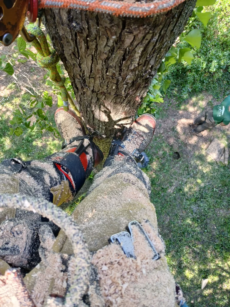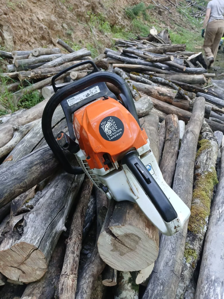 En démontage comme en élagage, nous utilisons des élagueuses, tronçonneuse de petit format et légère qui permettent d’être précis lors de la coupe dans les arbres.